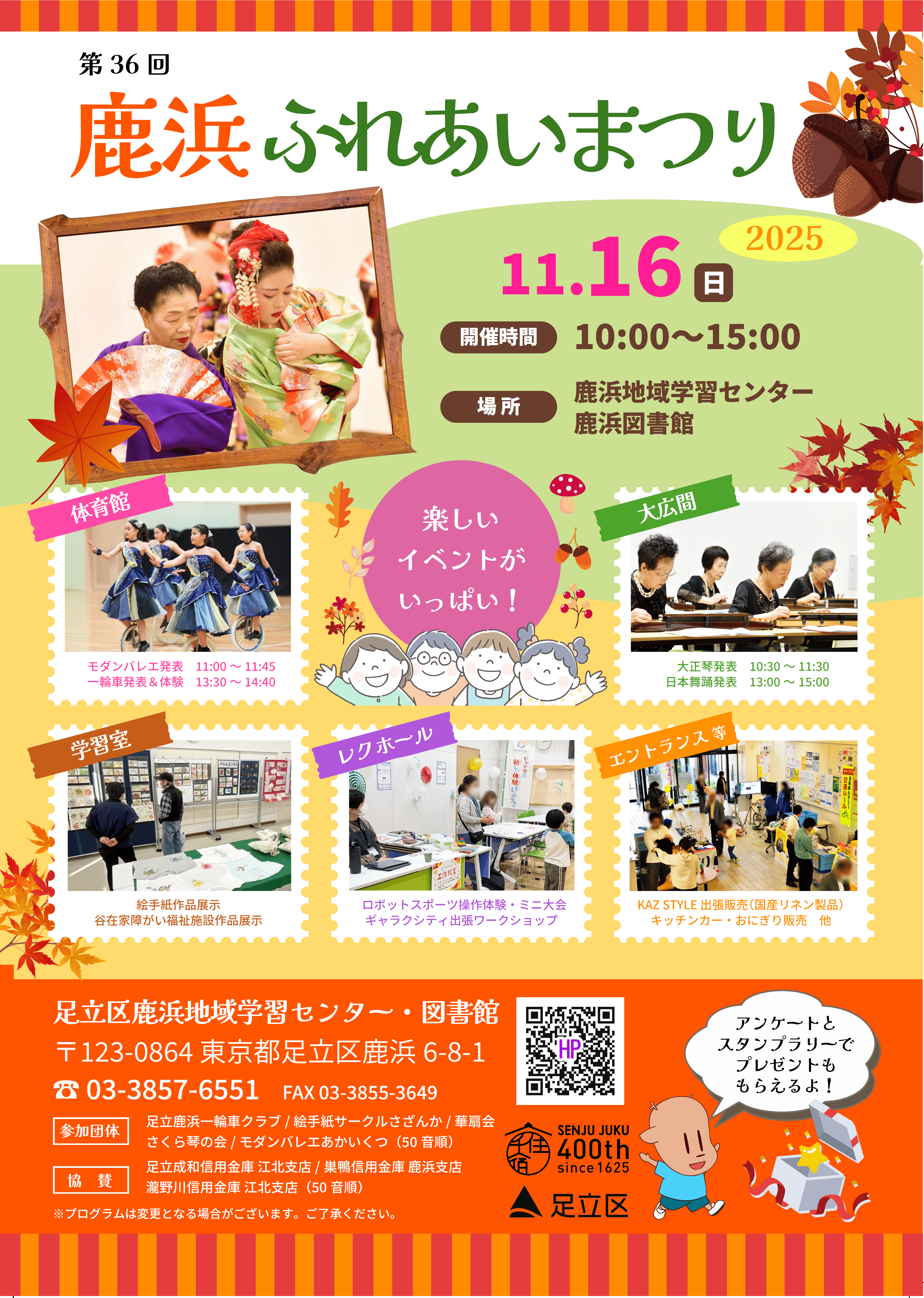 第36回鹿浜ふれあいまつり開催のお知らせ 2025年11月16日 年に一度の鹿浜センターのお祭り、鹿浜ふれあいまつり。 鹿浜地域学習センターの登録団体の皆様が発表や作品展示で日ごろの活動の成果を発表します。 他にもキッチンカーの販売やワークショップなどもありますので、ご家族やご友人をお誘いあわせのうえ、ぜひご来館ください。 【開催日】令和7年11月16日(日) 【開催時間】10:00~15:00 各団体の発表は画像のプログラムをご確認ください。